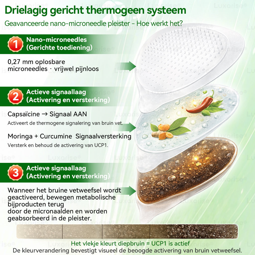 Deย BrownFat Extract Nano Microneedle Patchย werkt via een slim, vierstappensysteem voor de activering van bruin vet. Capsaรฏcine fungeert als hetย activeringssignaalย , dat bruine vetcellen zachtjes activeert en UCP1, het eiwit dat verantwoordelijk is voor thermogenese (vetverbranding), activeert. EGCG en curcumineย versterken en stabiliseren dit signaalย , waardoor bruin vet langer actief blijft en een efficiรซnt gebruik van vet en energie wordt ondersteund. Nano-micronaaldjesย brengen deze signalen vervolgens rechtstreeksย naar het vetweefsel direct onder de huid, waardoor een precieze, lokale werking gegarandeerd is zonder systemische verspreiding. Zodra de door UCP1 gestimuleerde vetverbranding op gang komt, reageert de patch op warmte en metabolische bijproducten met eenย zichtbare kleurverandering van transparant naar diepbruinย , wat realtime bevestigt dat het bruine vet actief aan het werk is. Samen helpt dit gesloten systeem de energieverbranding te verhogen, de vetstofwisseling te ondersteunen en de eetlust op natuurlijke wijze te reguleren โ waardoor gewichtsbeheer zowel effectief als zichtbaar wordt.